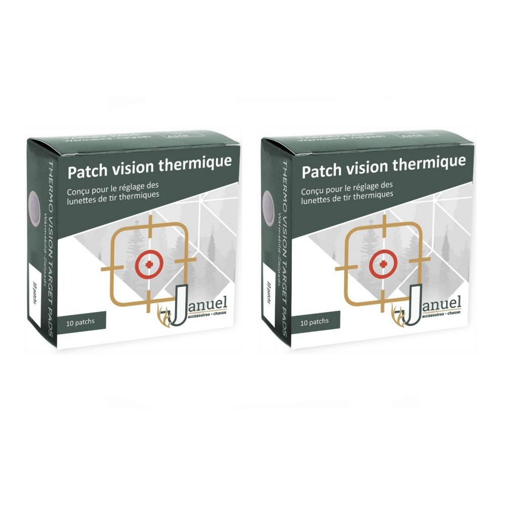 2 boites de 10 patchs thermique Januel pour régler les modules de tir à vision thermique avec précision. Les patchs thermiques fonctionnent au contact de l'air ambiant. Pour activer le patch, il suffit de le sortir de son emballage plastique. Vous pouvez ensuite décoller la protection de l'adhésif au dos du patch, pour le coller au centre de votre cible. Le patch met 3 à 4 minutes pour atteindre sa température de fonctionnement de 38°C. C'est la température idéale pour régler votre lunette de tir thermique. Son diamètre de 5 cm est parfait pour des réglages jusqu'à 100 m.